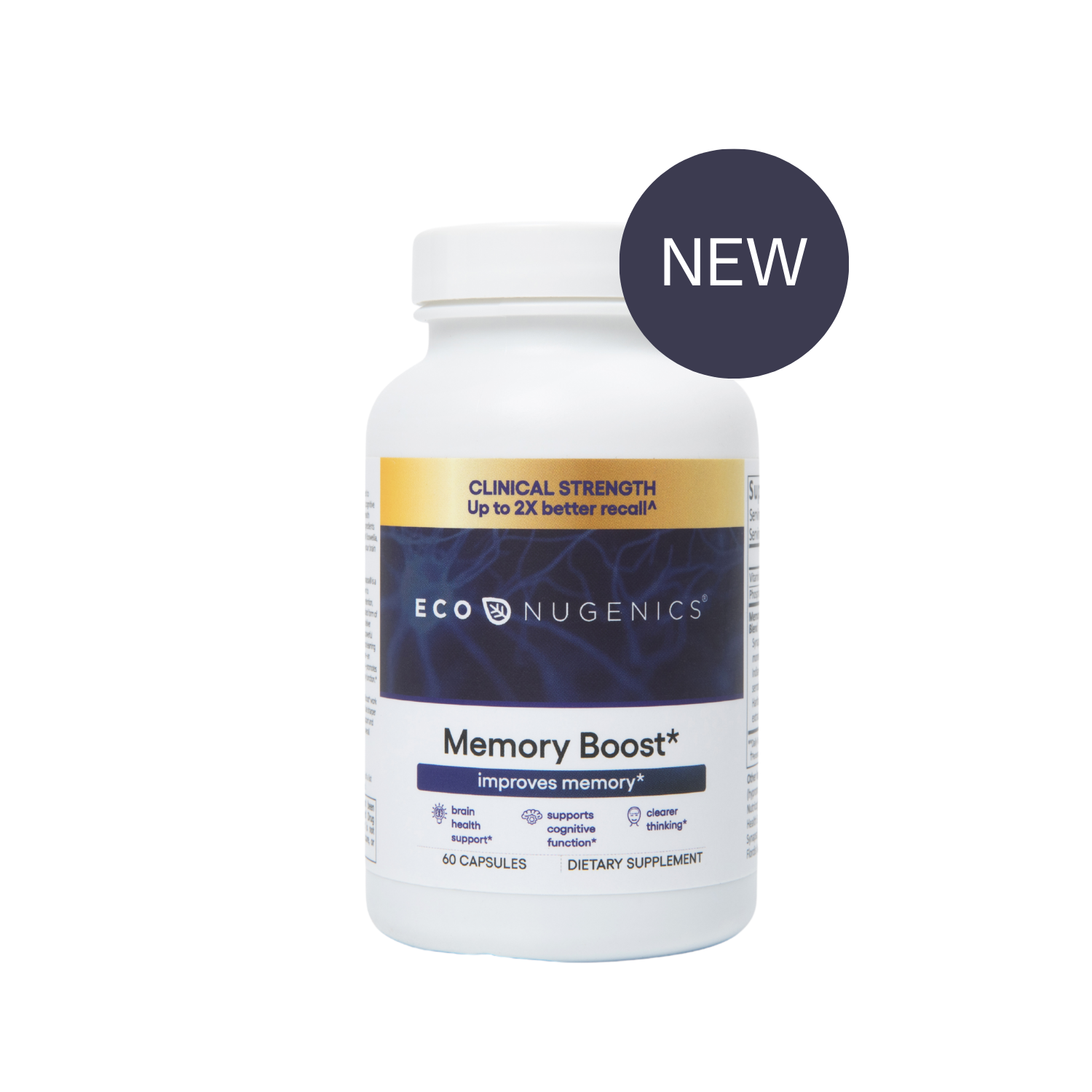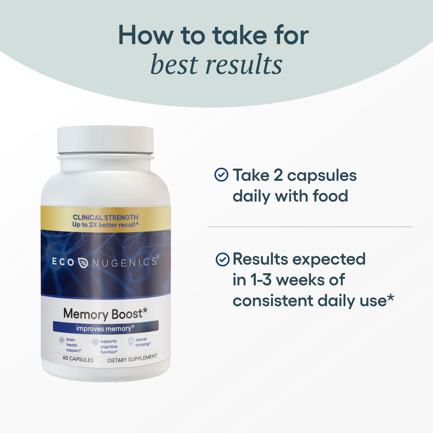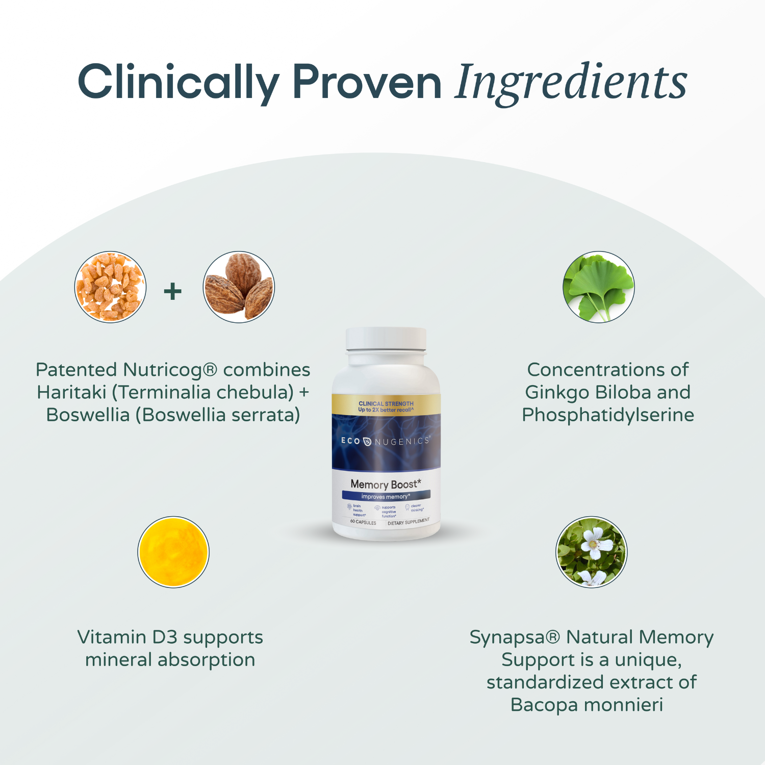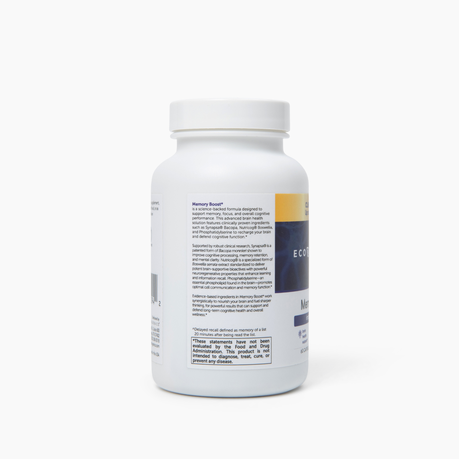 Memory Boost is a science-backed formula featuring clinically researched ingredients that work together to improve memory, support brain health and cognitive function, and promote clearer thinking, with up to 2x greater memory recall. This clinical-strength brain health solution includes proven, patented ingredients like Synapsa® Bacopa, and Nutricog® Boswellia, along with phosphatidylserine, to boost cognitive function, improve memory and focus, and support brain and neurological health for optimal aging and long-term wellness.*